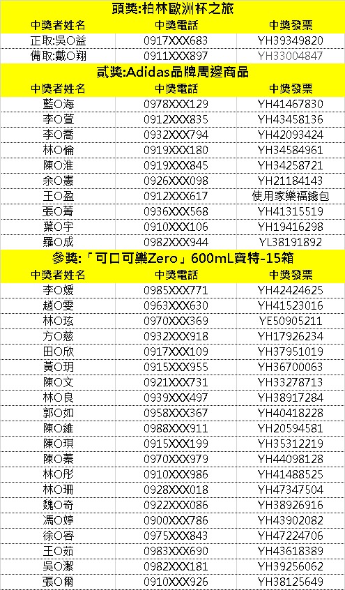 1. 中獎者請自行下載領獎信函: https://reurl.cc/nN1qXd ,將填妥後「領獎信函」+「身分證正反面影本」+「中獎發票或家樂福錢包消費明細」,於兌獎收件截止時間前將兌獎資料送達【可口可樂x家樂福限定歐洲盃活動小組收】, 逾期視為放棄該得獎權利,不得向主辦單位要求任何補償。