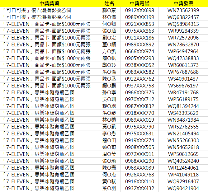 中獎名單