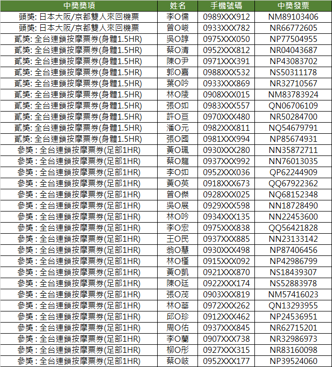 貳獎: 全台連鎖按摩票券(身體2HR) 乙名(參考市值$ 2,600),共10名